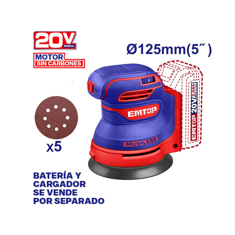[ELROS2002] - LIJADORA ROTO-ORBITAL INALAMBRICA, 20V. 5 PULGADAS, SIN BATERIA NI CARGADOR, (BARE TOOL). EMTOP