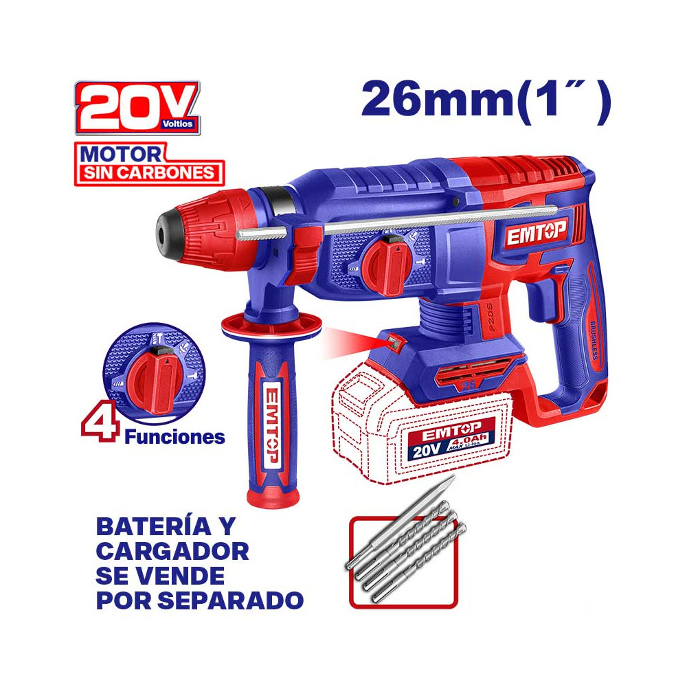 Acerca de este producto: - El rotomartillo inalámbrico EMTOP ELRH20268 está diseñado para ofrecer potencia, precisión y versatilidad en perforación, taladrado y cincelado.