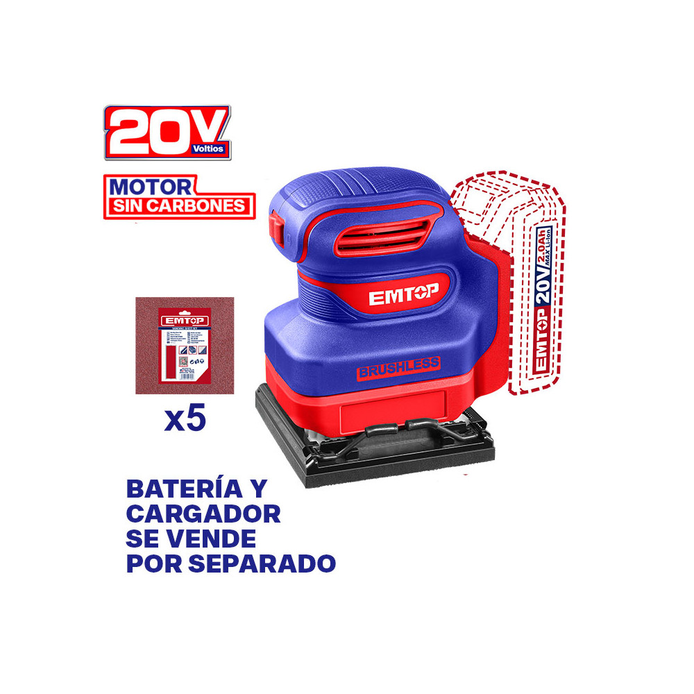 LIJADORA ORBITAL 1/4 DE HOJA INALAMBRICA, 20V. BRUSHLESS, 12,000 RPM, SIN BATERIA NI CARGADOR, (BARE TOOL). EMTOP