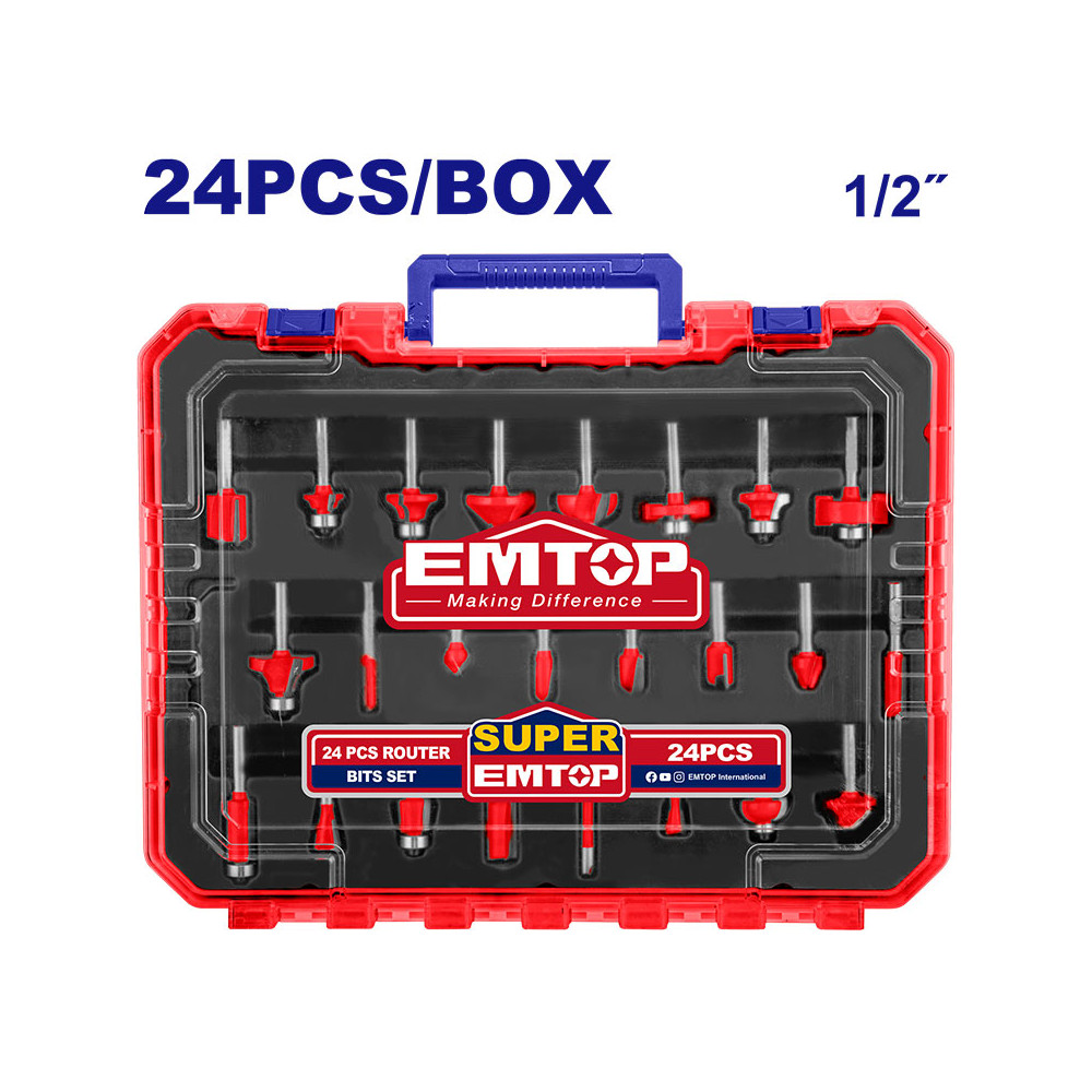 El juego de 24 cuchillas para router EMTOP ULRRT24122 ofrece una amplia variedad de fresas para realizar cortes precisos, limpios y profesionales en madera, MDF y materiales derivados.