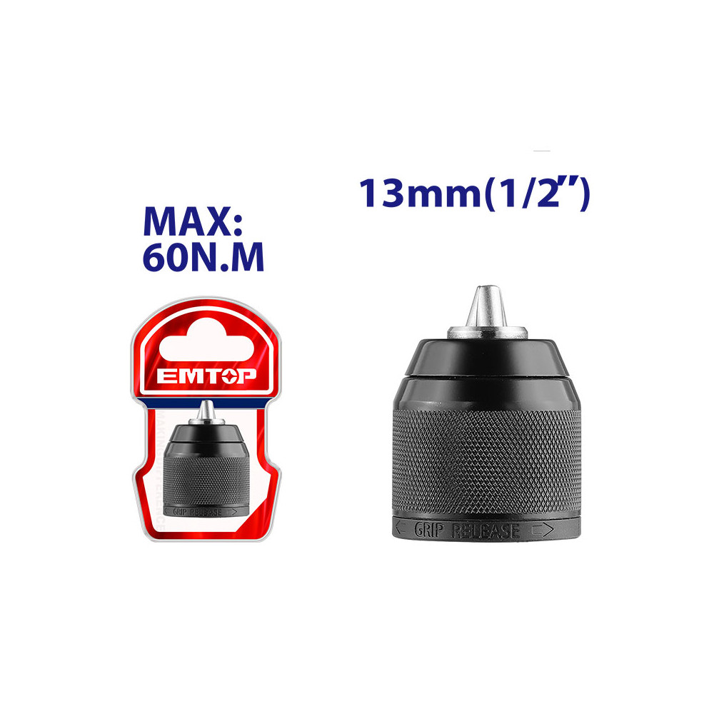 Acerca de este producto: - El mandril/portabrocas EMTOP EKCY13201 está diseñado para ofrecer sujeción rápida, segura y sin necesidad de llave, facilitando el cambio de brocas en trabajos de perforación y atornillado.